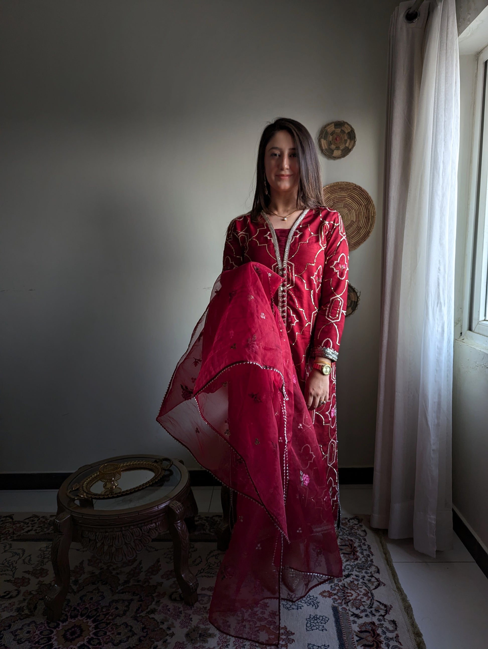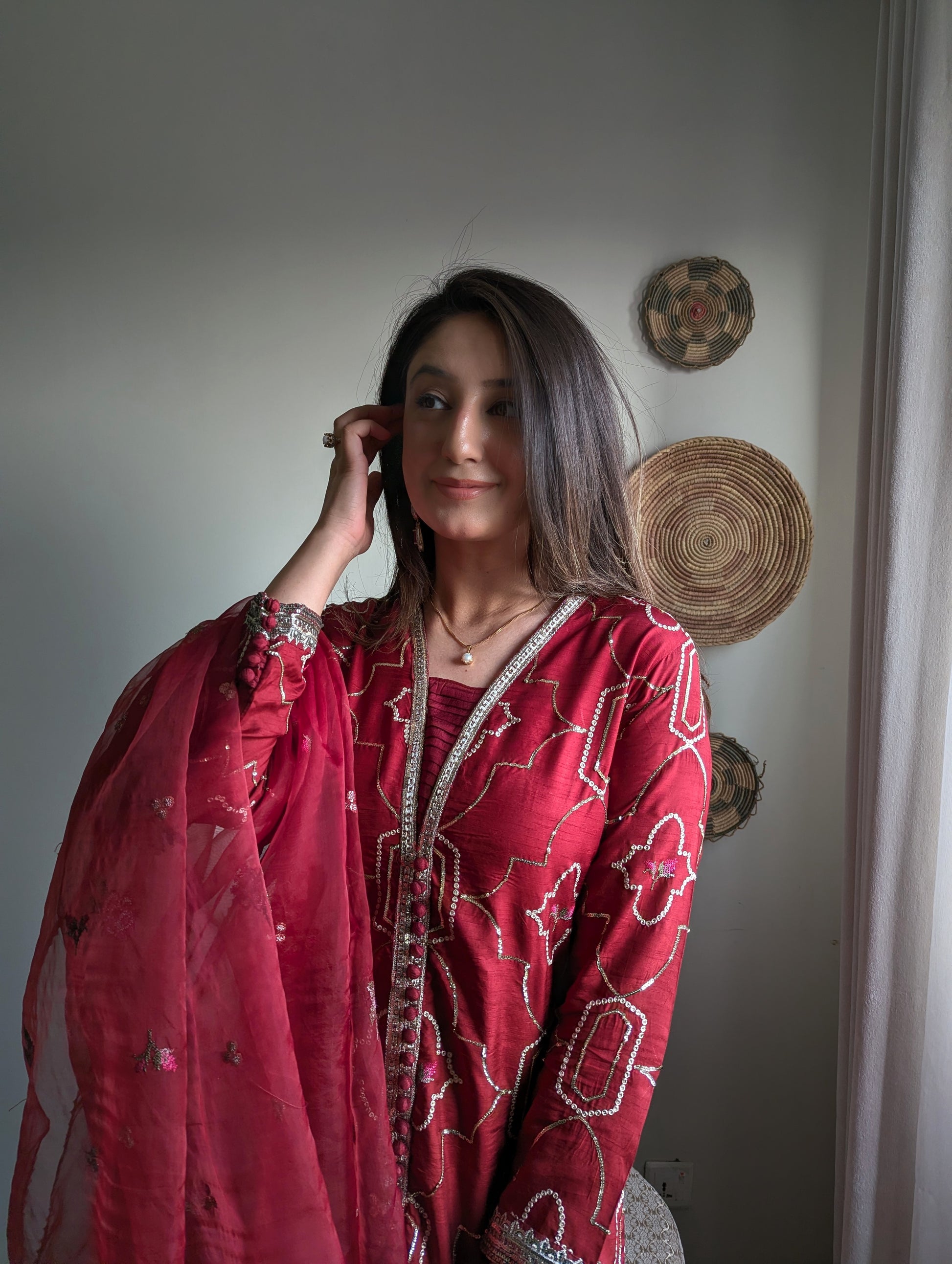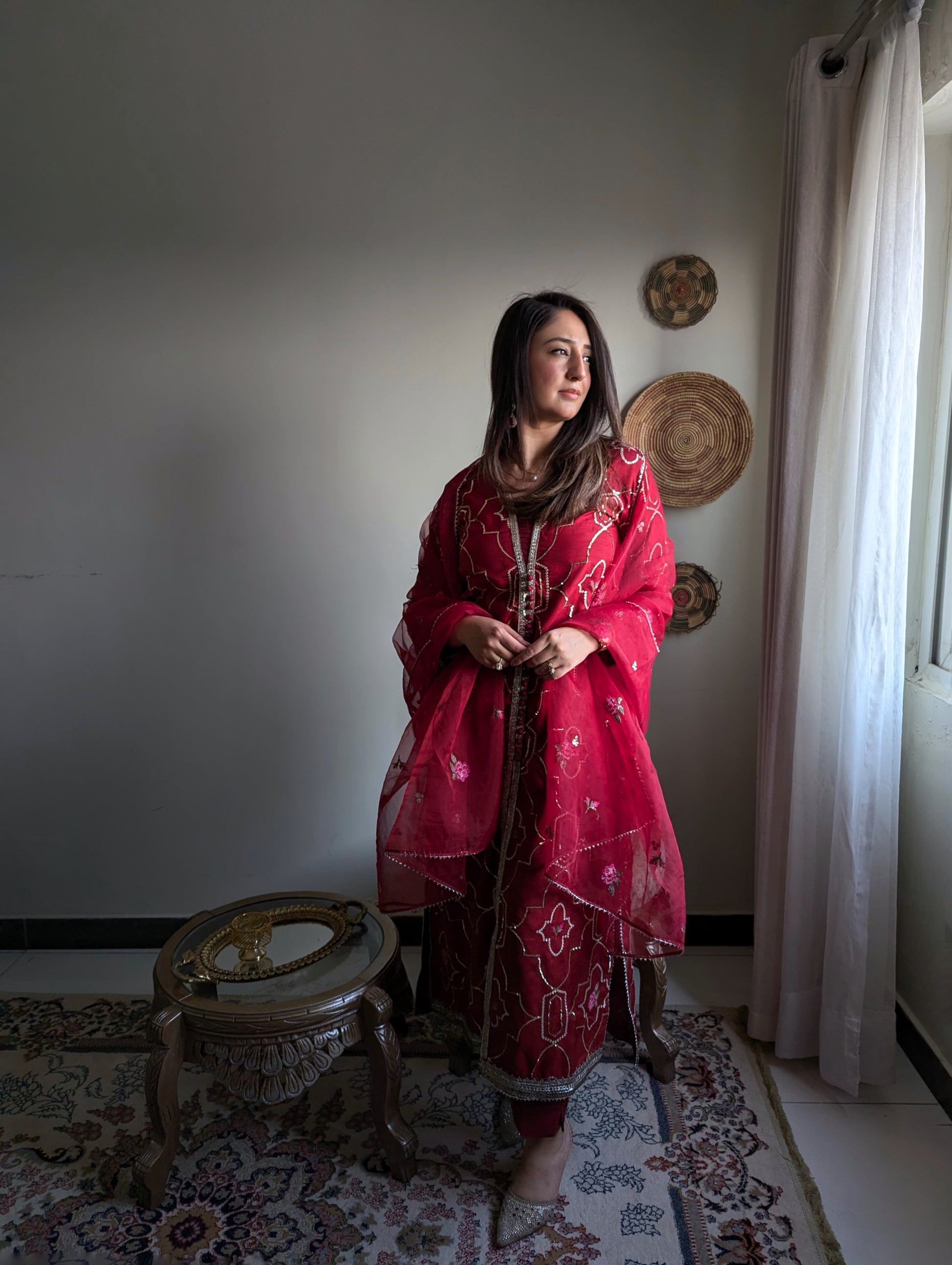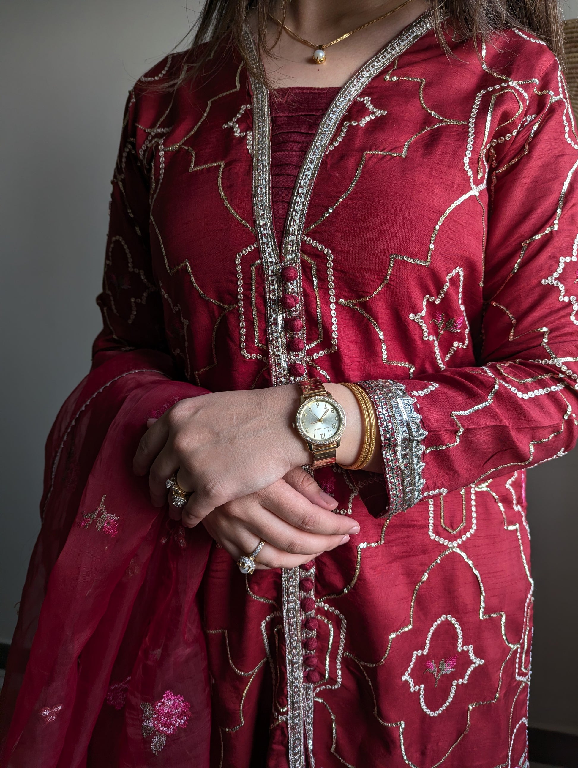 Type: Embroidered Korean Silk Shirt with Raw Silk Trouser and Organza Dupatta