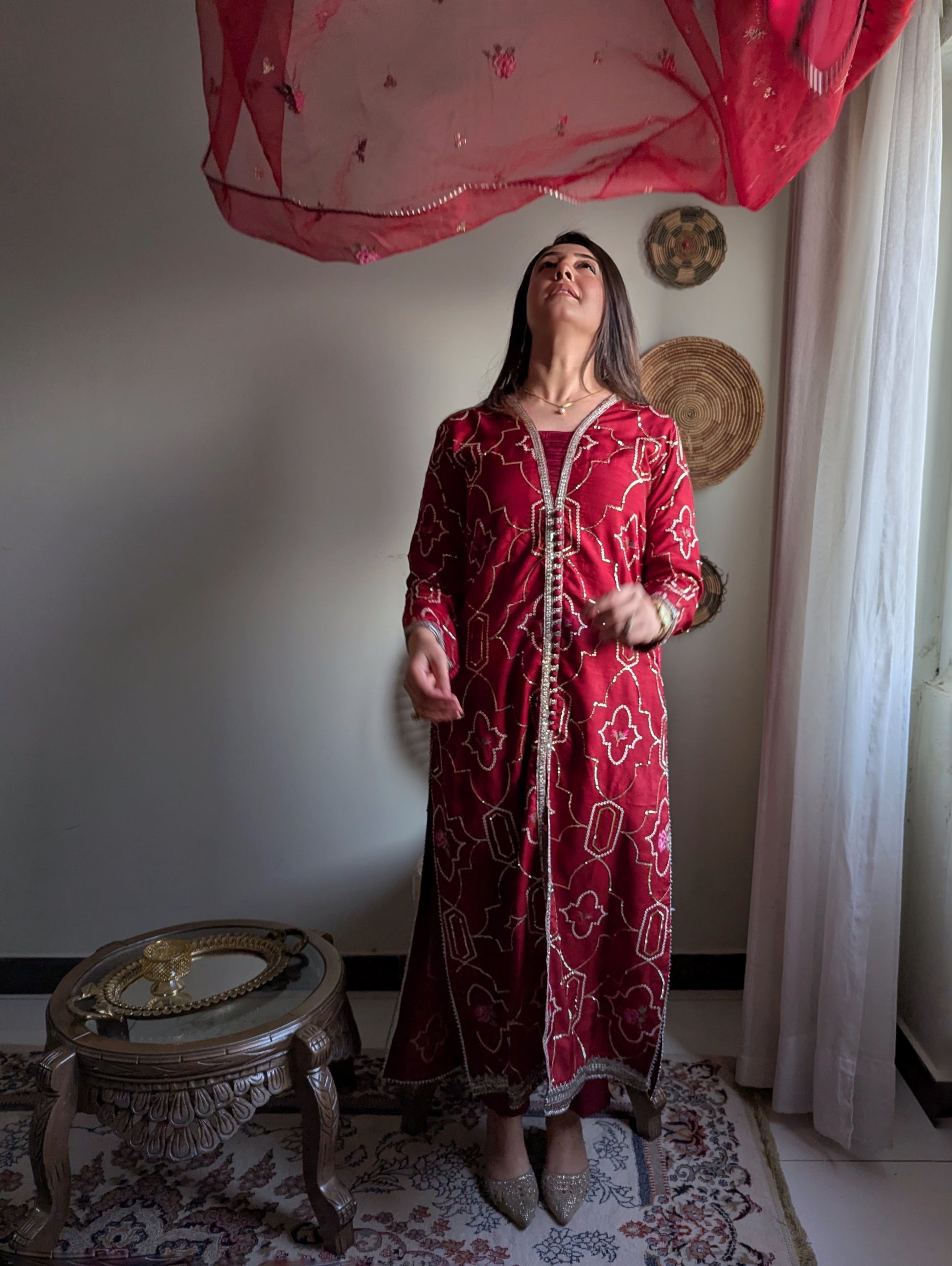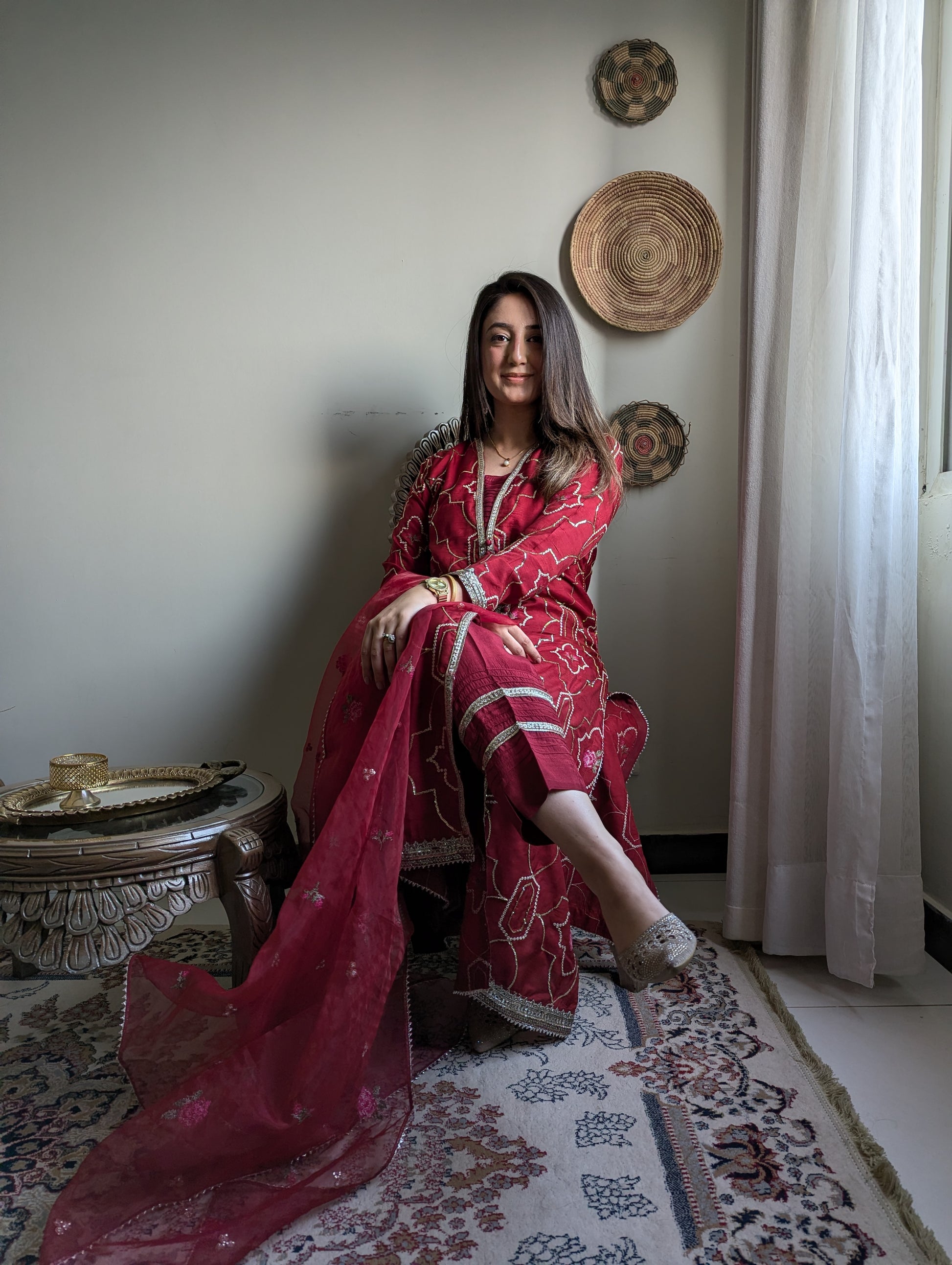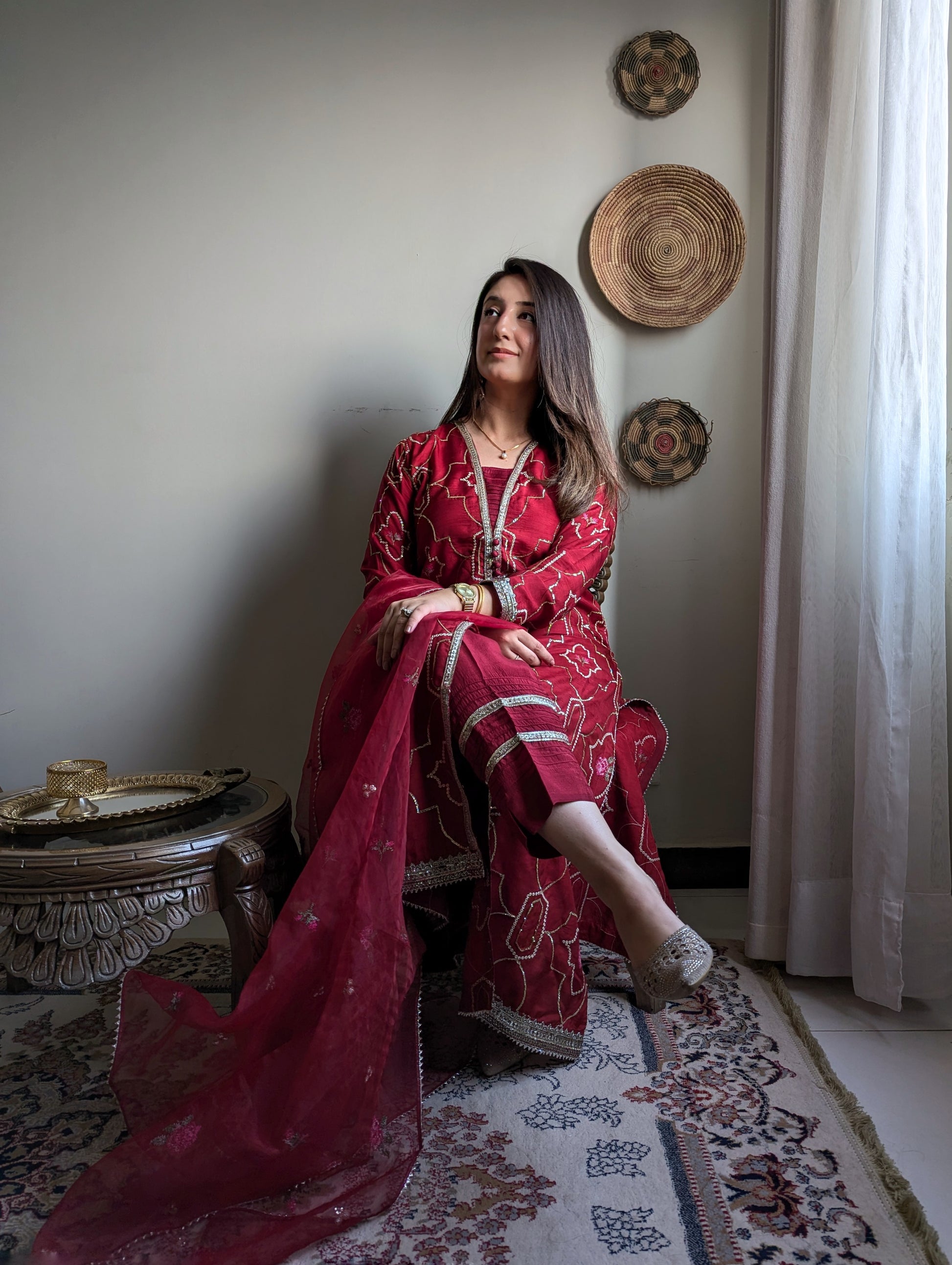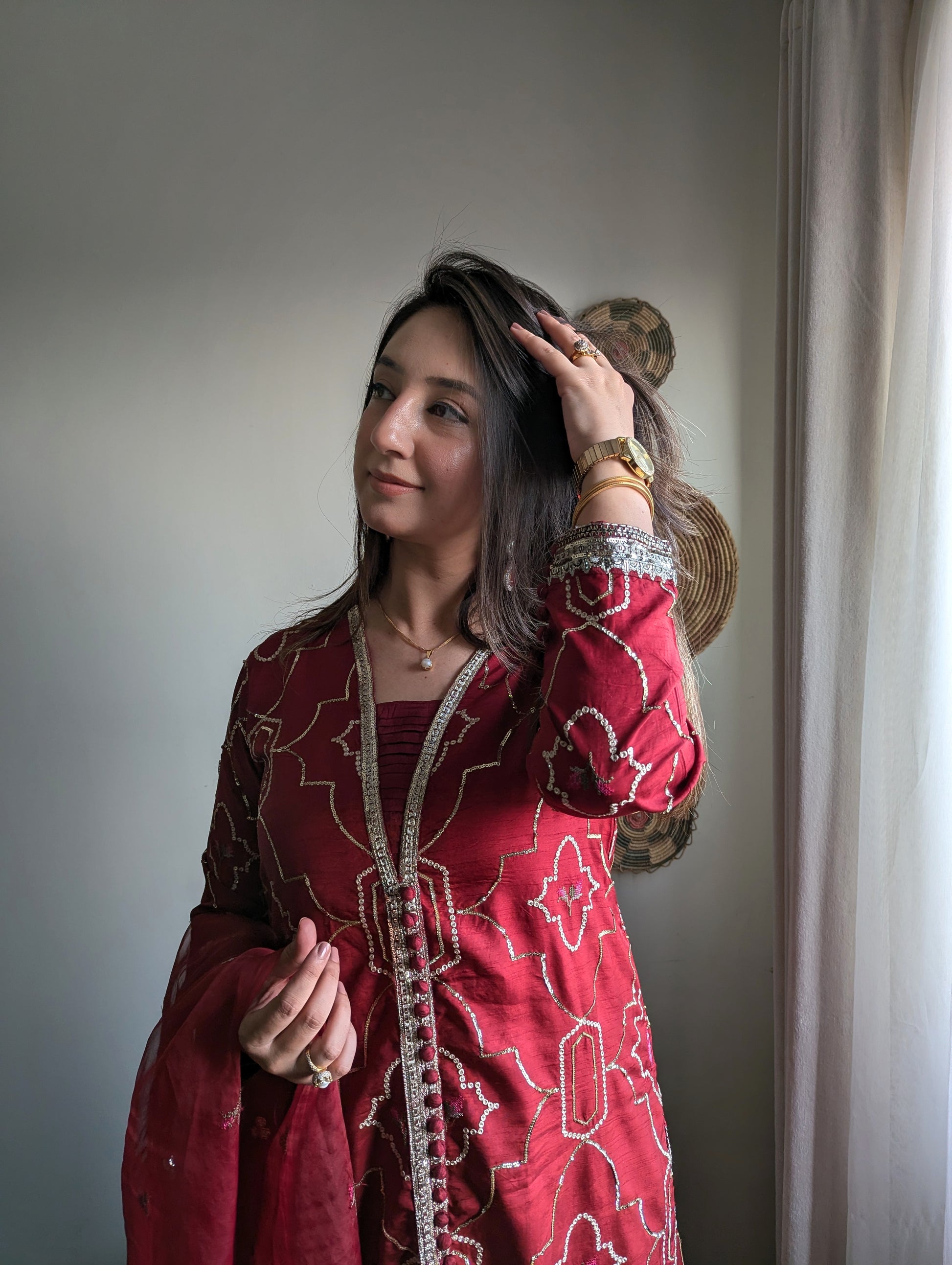 Type: Embroidered Korean Silk Shirt with Raw Silk Trouser and Organza Dupatta