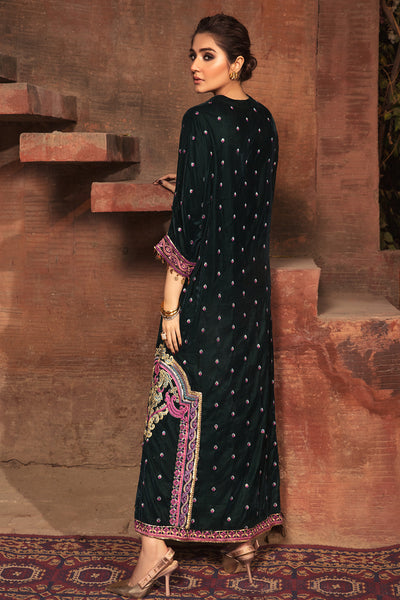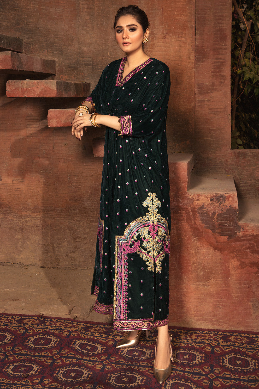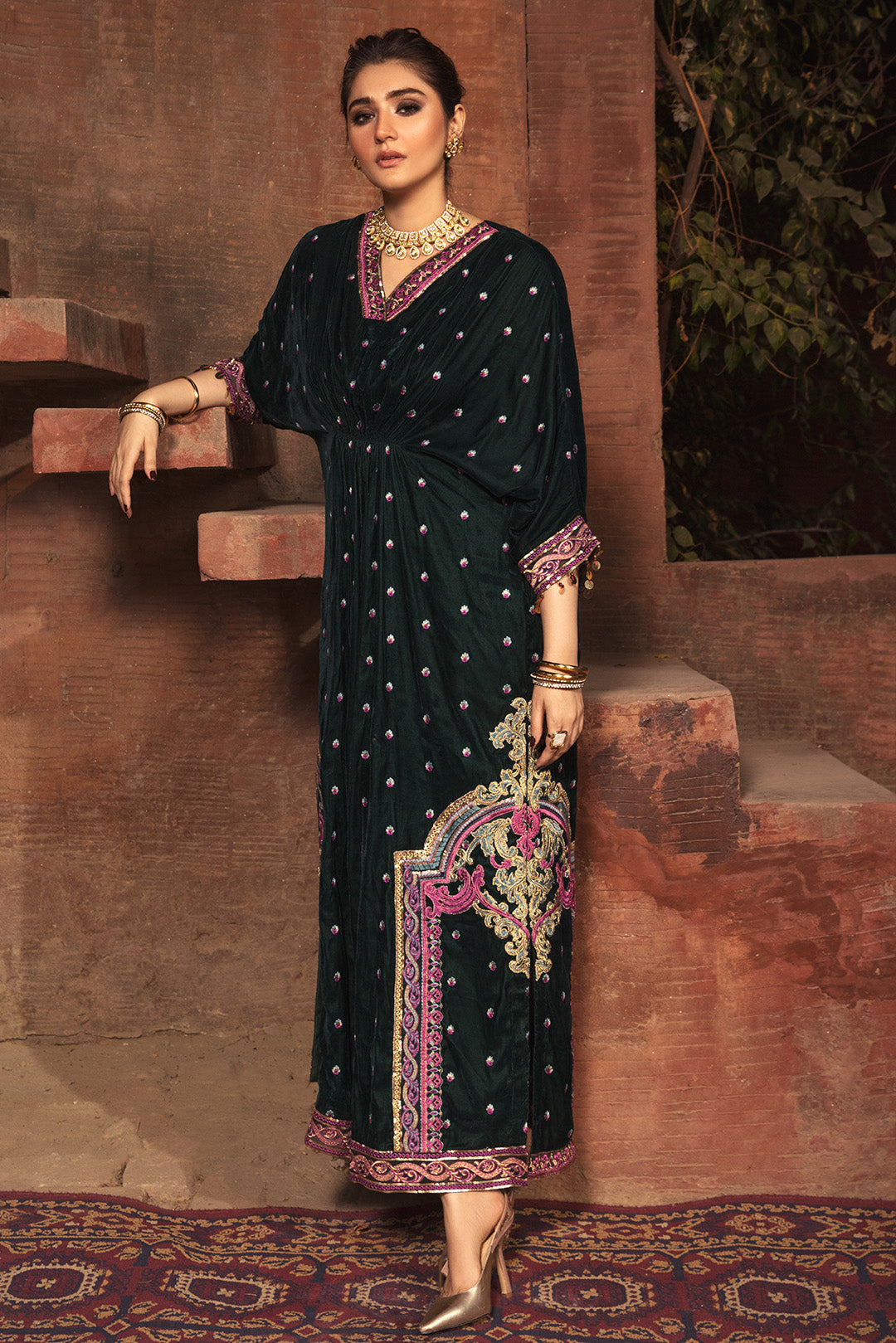A composition of emerald green velvet Kaaftan adorned with complex thread and tilla embroidery. It is ideal for the fall and winter season, works for all kinds of events.