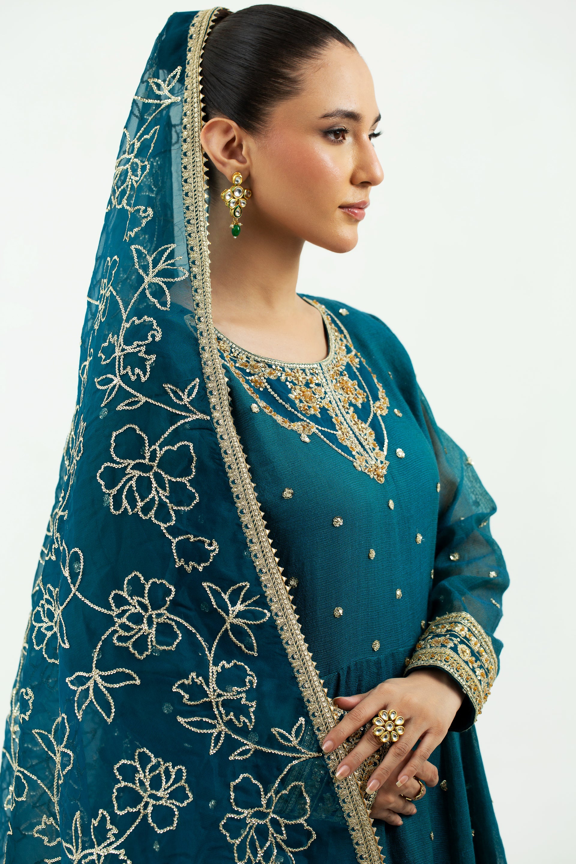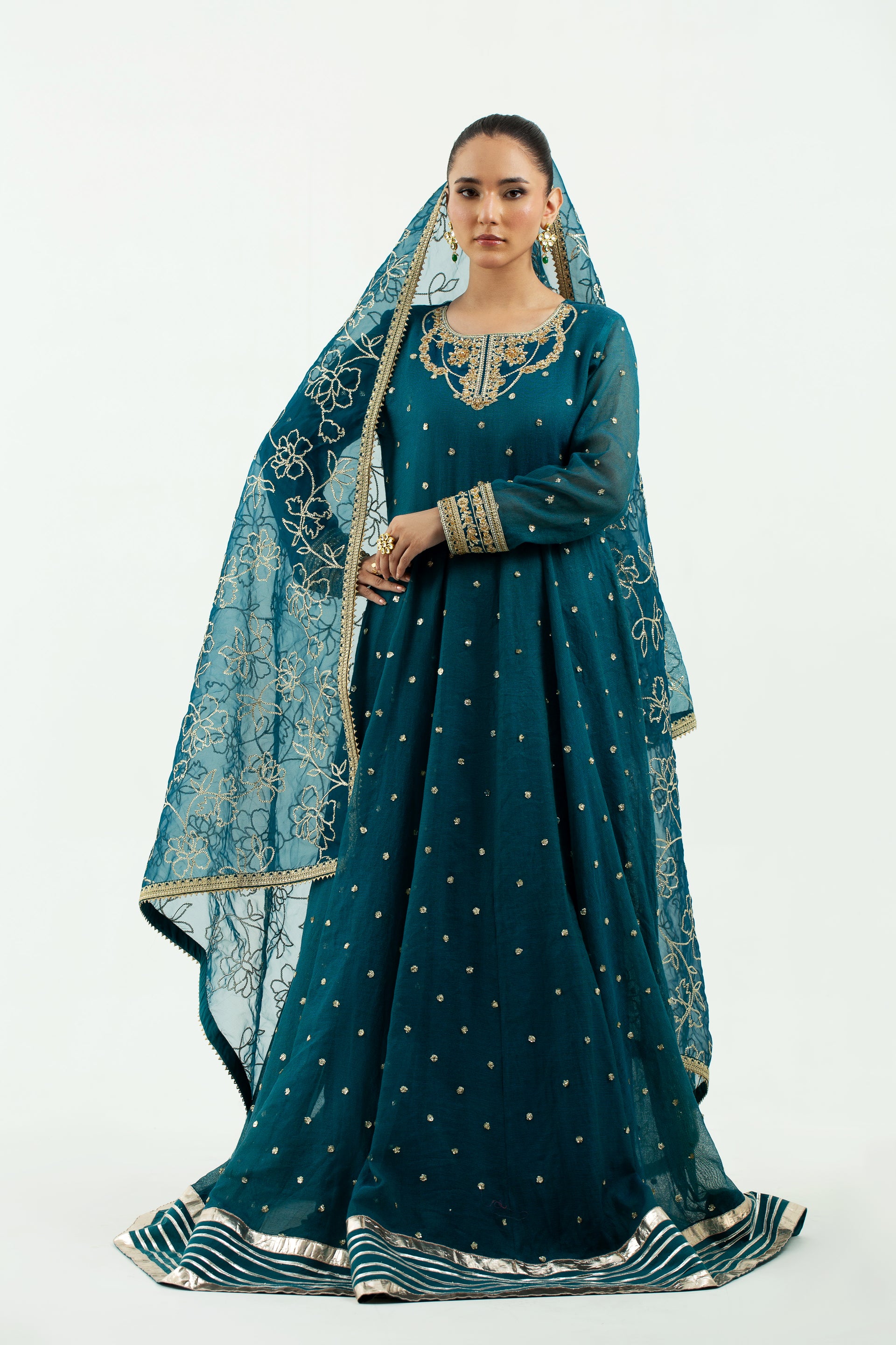 Discover the epitome of festive elegance with our teal green pishwas, a dazzling symphony of muted sophistication and contemporary flair. Crafted with finesse Yarn Dyed cotton net Frock and grip lining. Add a touch of ethereal charm with the embroidered Soft organza dupatta, completing the look with grace and refinement.