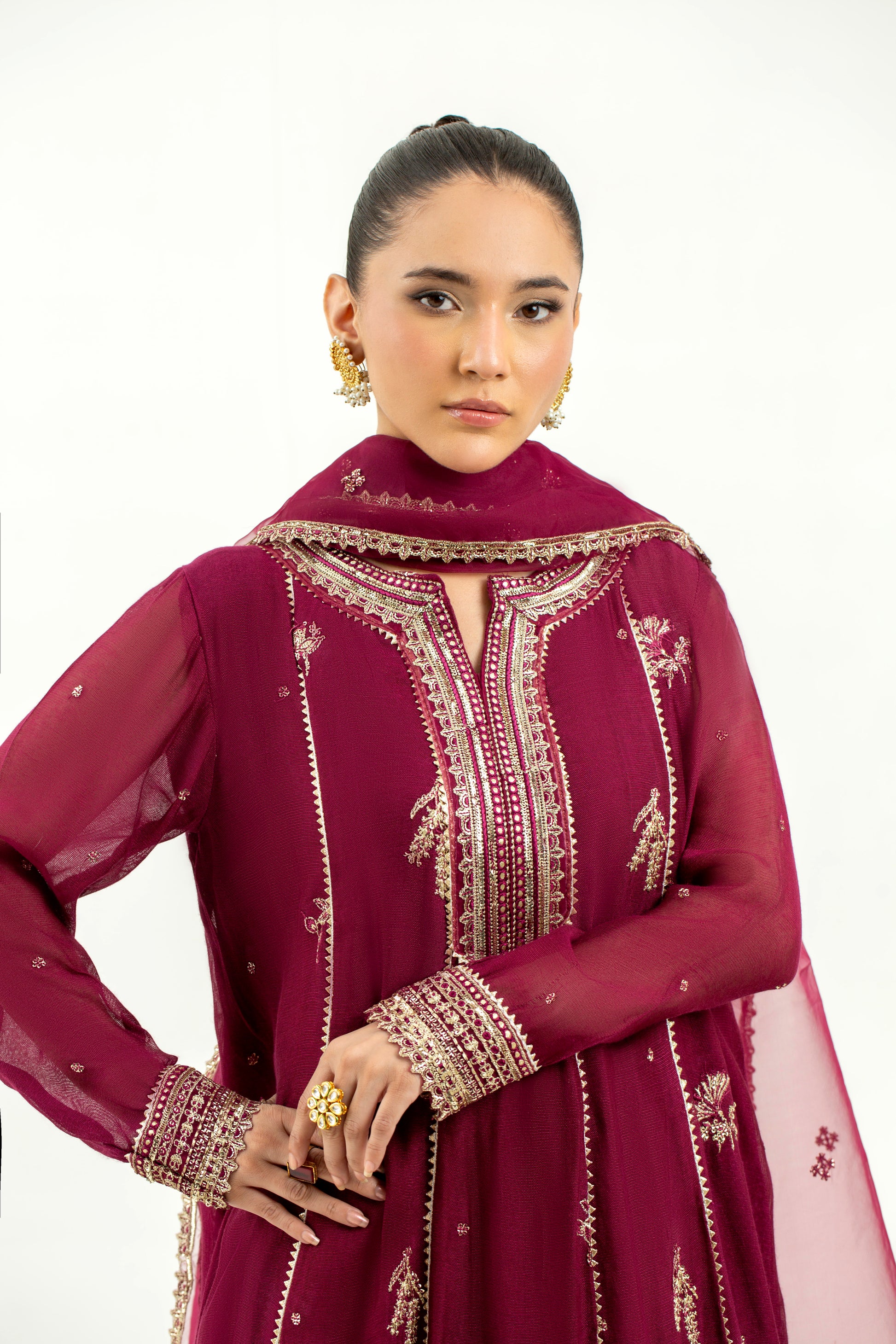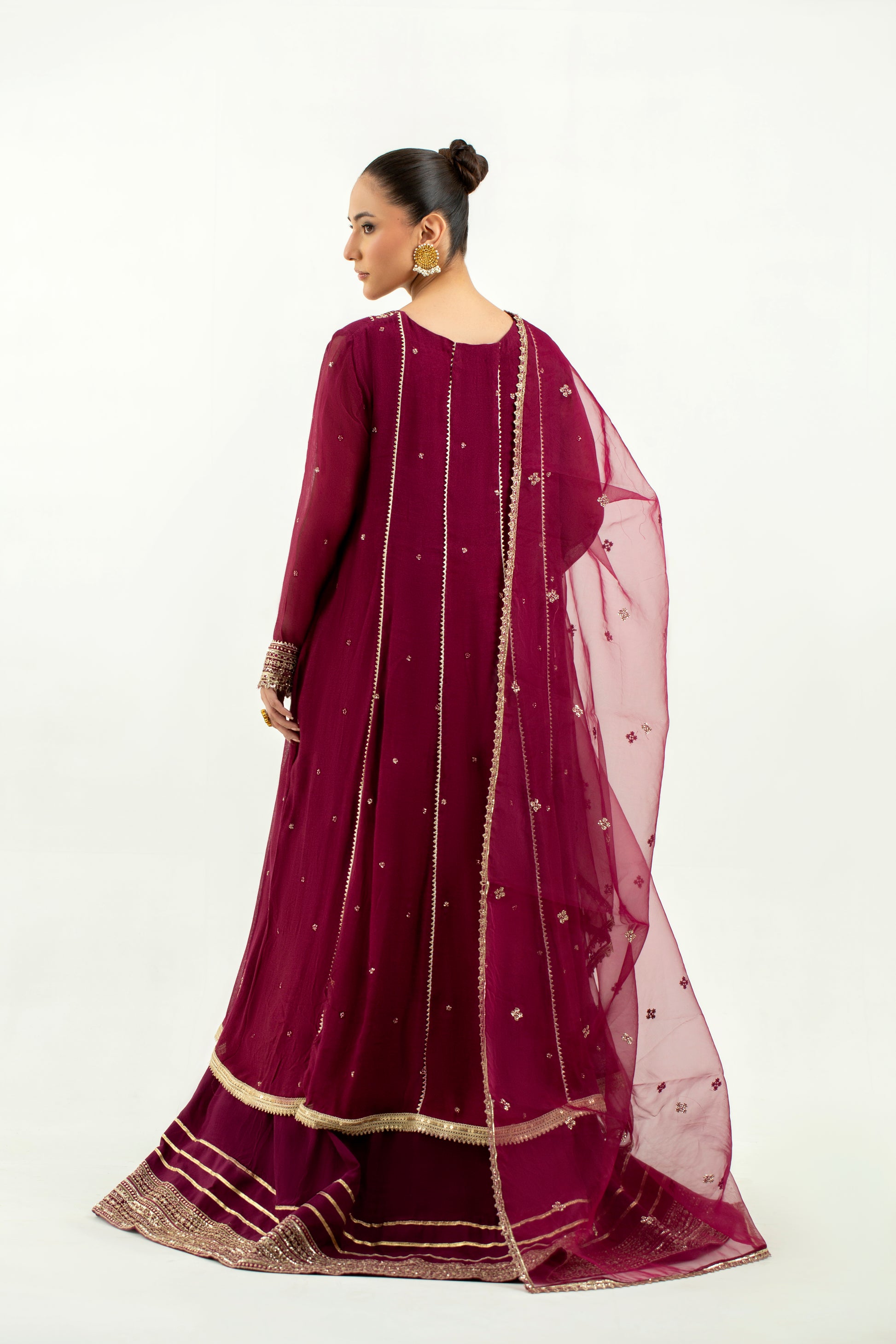 Elevate your festive style with our maroon dress. This stunning pishwas, crafted from yarn-dyed cotton net and grip, is generously embellished with golden embroidery and enhanced with intricate lace detailing. The ensemble is completed with a soft organza dupatta, featuring a minimal embroidered spray and four-sided lace, creating a refined and graceful outfit.