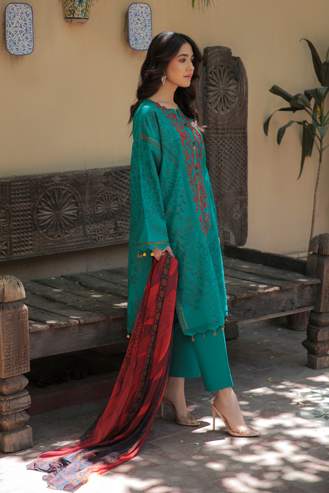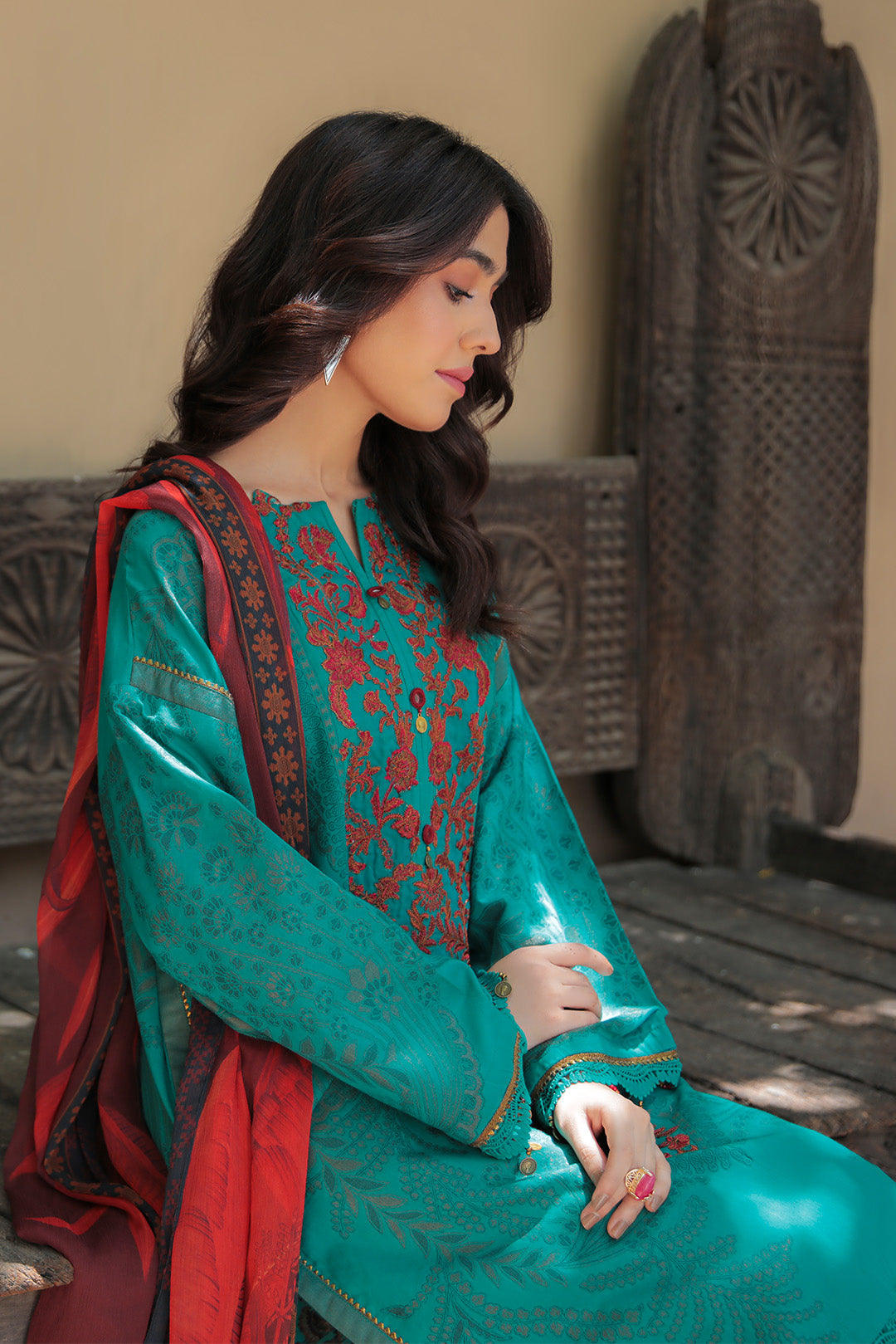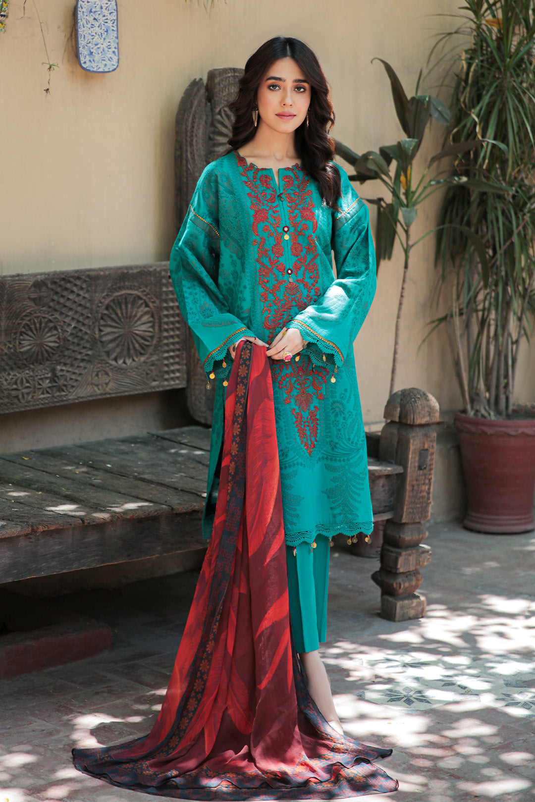 Type: 3 Piece - Dyed Embroidered Jacquard Shirt with Chiffon Dupatta and Cambric Trouser