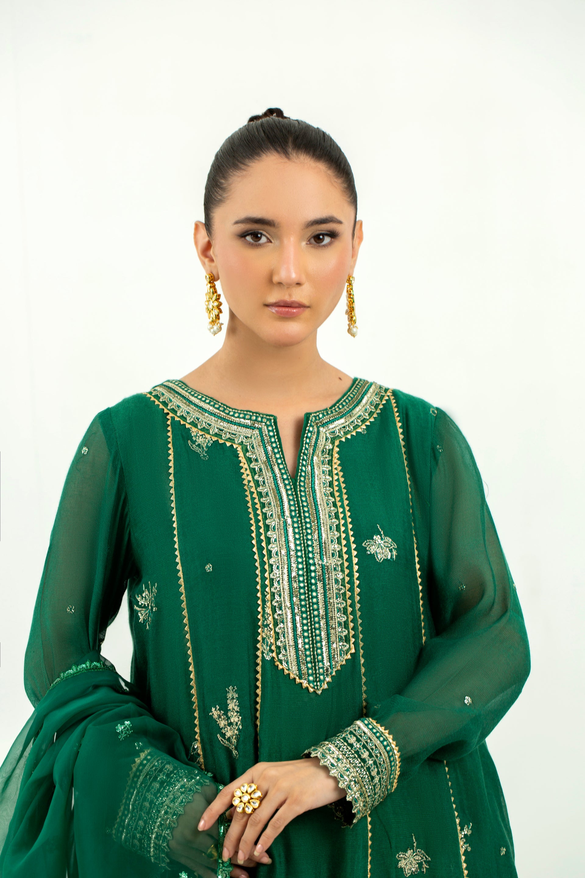 Elevate your festive style with our bottle green dress. This stunning pishwas, crafted from yarn-dyed cotton net and grip, is generously embellished with golden embroidery and enhanced with intricate lace detailing. The ensemble is completed with a soft organza dupatta, featuring a minimal embroidered spray and four-sided lace, creating a refined and graceful outfit.