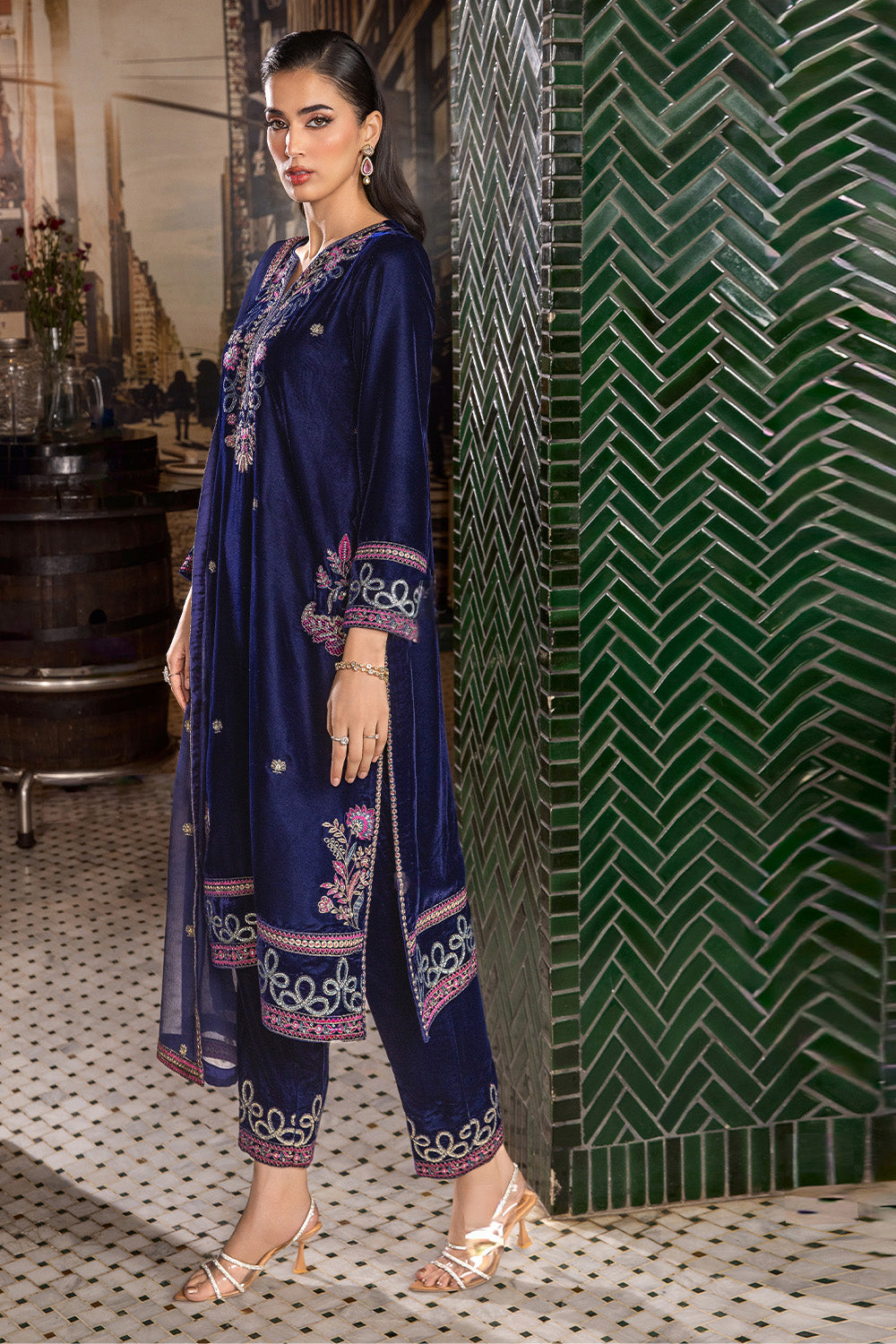 3 Piece - Embroidered Premium Velvet Shirt and Trouser with Embroidered Bamberg Chiffon Dupatta