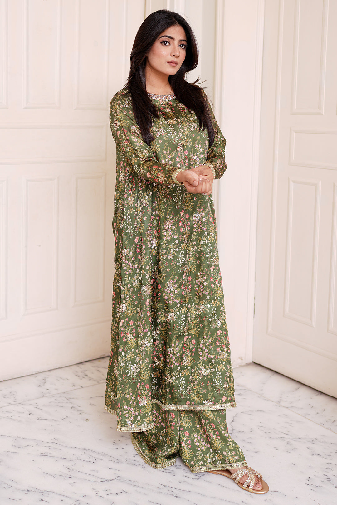 Type: Embroidered Shamooz Silk Shirt with Digital Printed Silk Trouser and Dyed Embroidered Net Dupatta