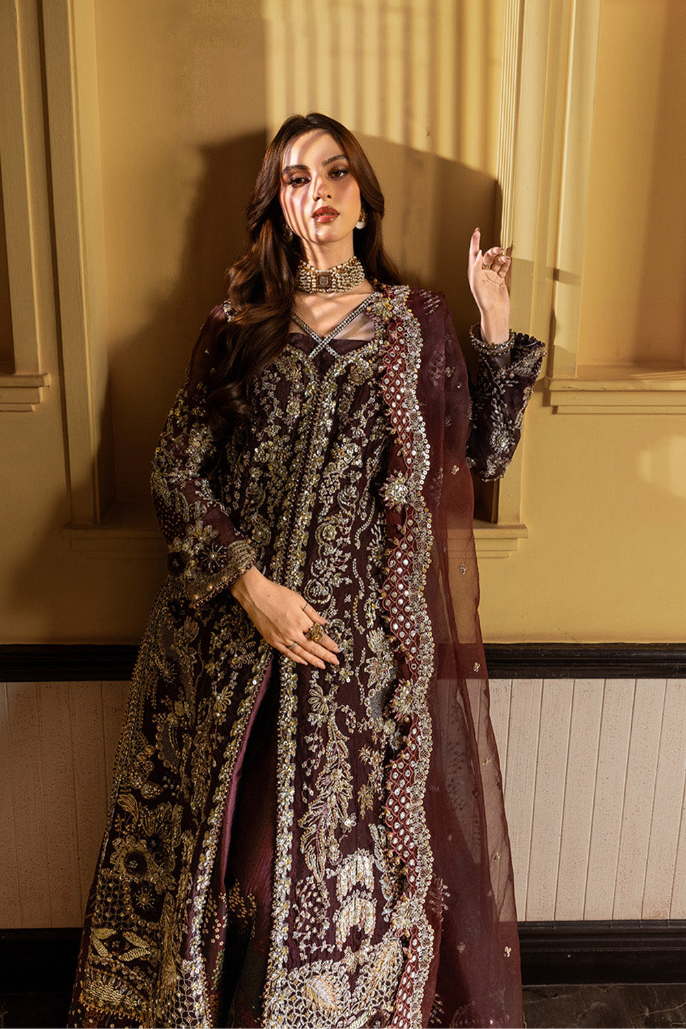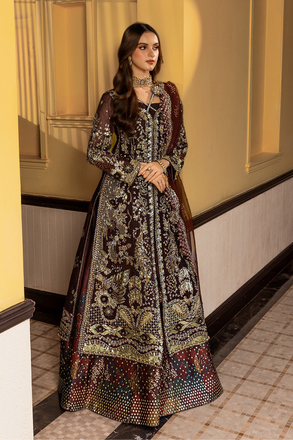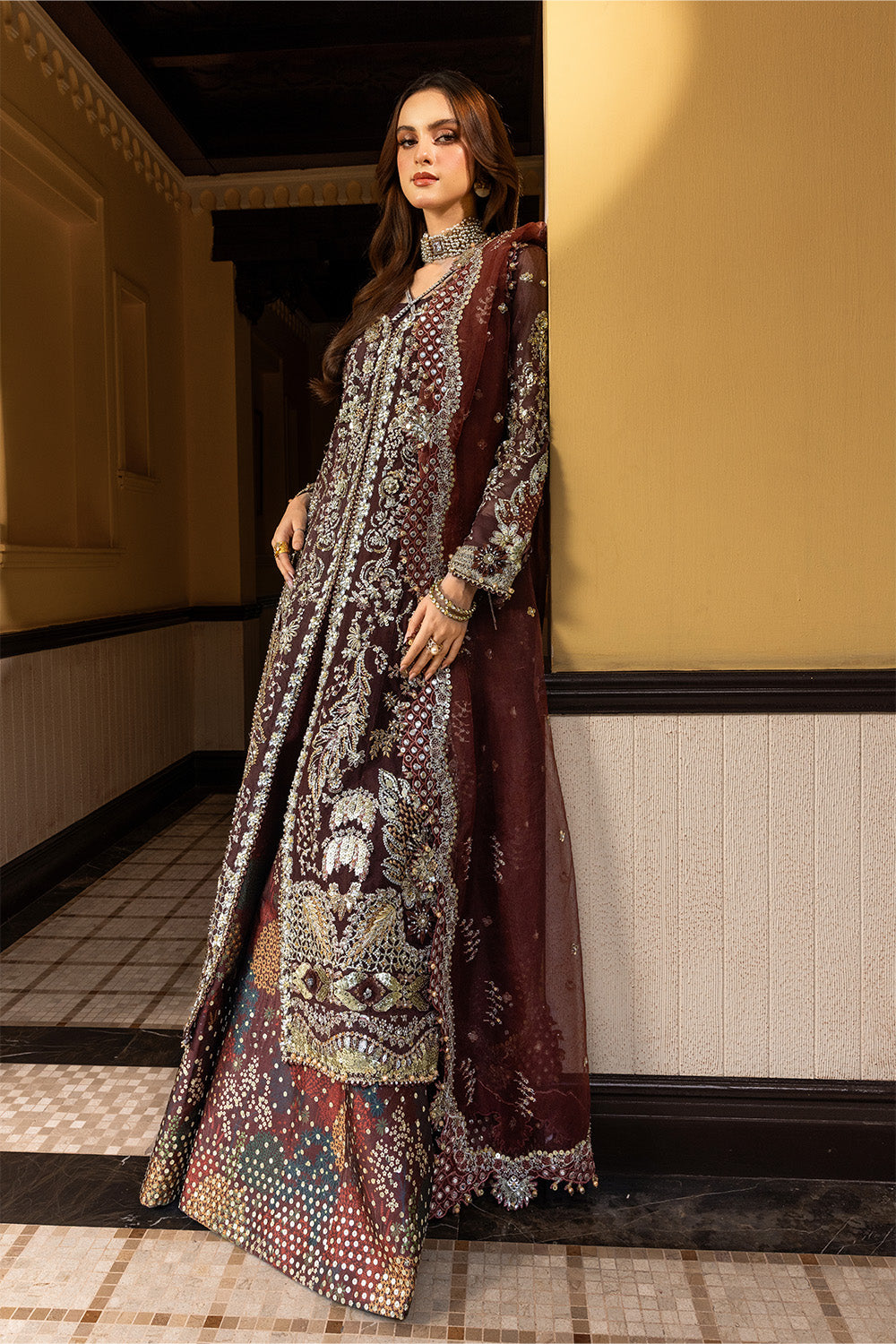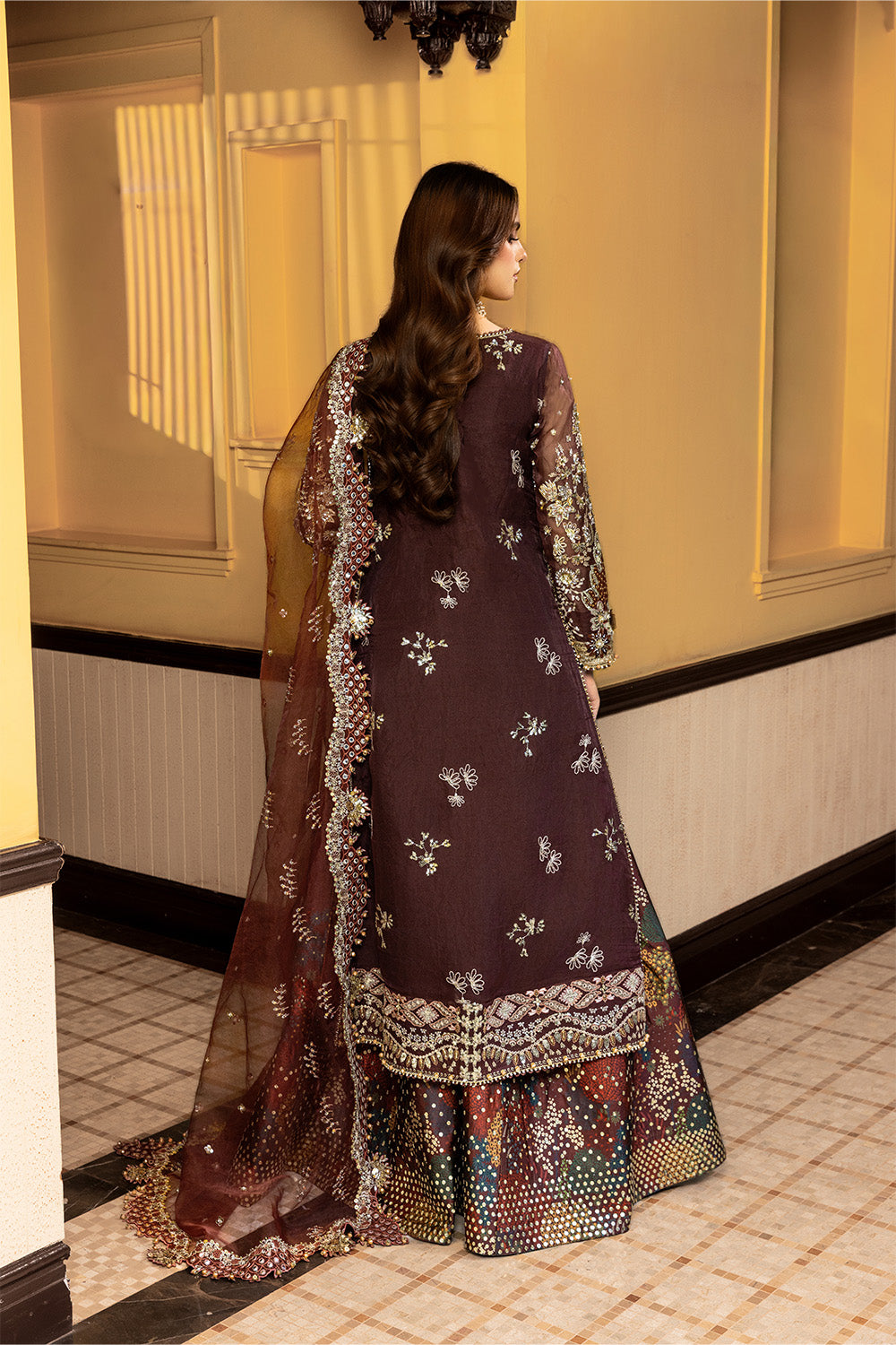 This regal brown outfit showcases exquisite embroidery and delicate embellishments(dabka, naqshi work) across organza panels and borders. Paired with a hand-embellished premium shamoz silk printed sharara and hand embellished and embroidered dupatta for a look of pure sophistication. The dress is designed and adorned with embellished organza 3D flowers.