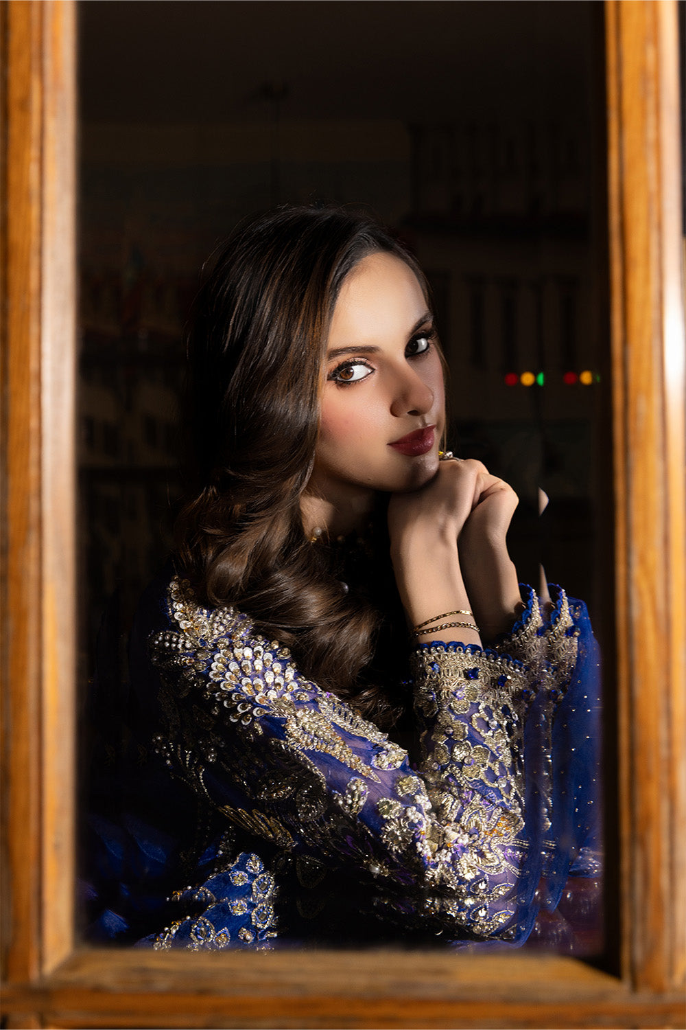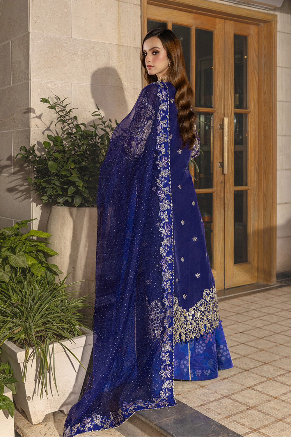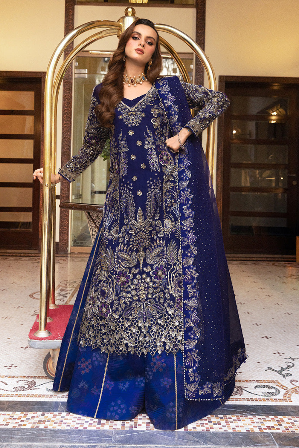 A luxurious creation adorned with detailed embroidery and handcrafted adda work. The embellished stone work dupatta and printed shamoz silk sharara complete this masterpiece of timeless grace. The dress is designed and adorned with embellished organza 3D flowers.